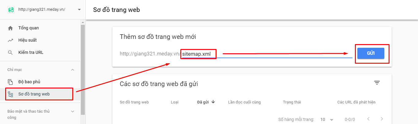 - Bước 6: Bạn vào mục Sơ đồ trang web >Thêm mới sơ đồ trang web - bạn nhập sitemap.xml ấn gửi là được